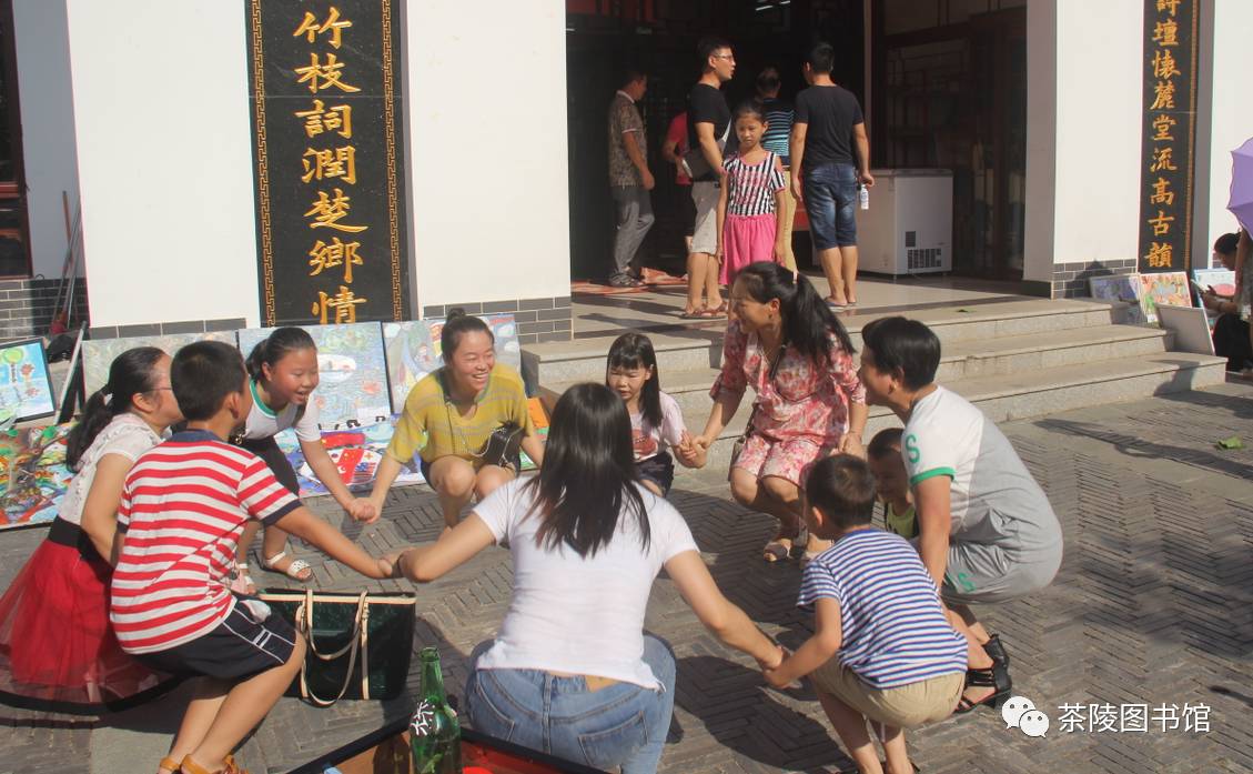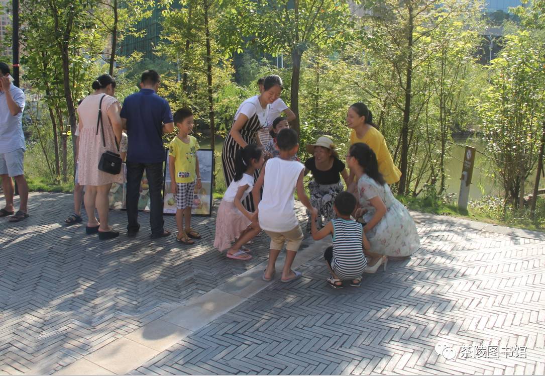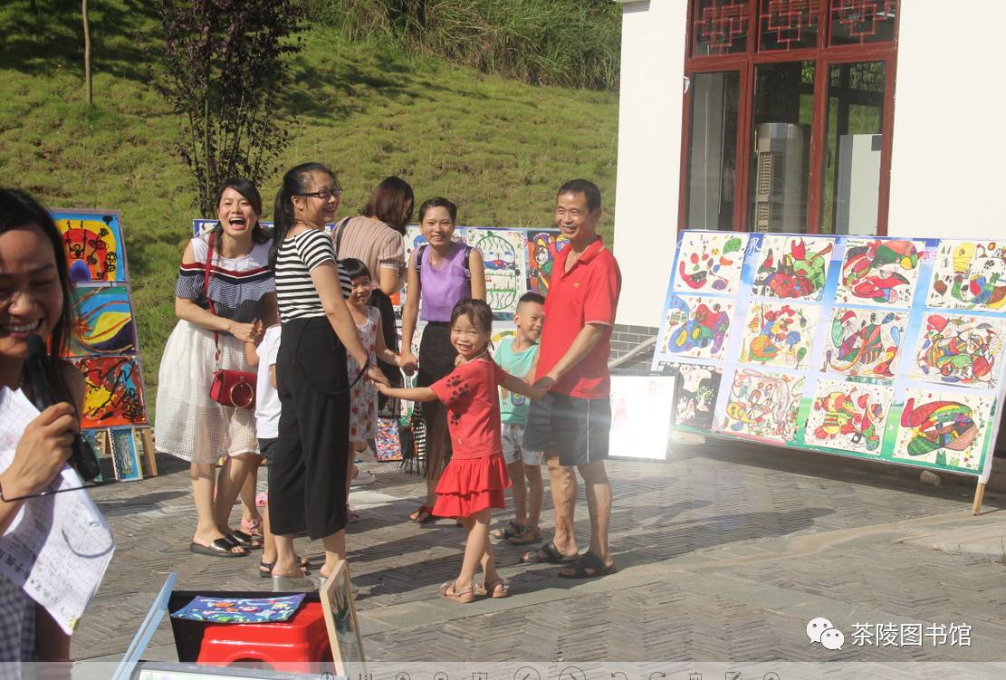 “早起的鸟儿有食吃,早起的人儿有画展看”,大家都早早的来到东阳书屋看画展,就连鸟儿叽叽喳喳的也似乎在庆祝这次画展的成功举行! “这是我画的画,连老师都夸我画的好呢,你们看这是树、这是鸟、这是彩虹.......”小朋友高兴地向家长们解释自己画画的构思。 上午9时,本次画展进入白热化状态,现场观看人数及气氛热烈火爆,图书馆工作人员有条不紊地维持秩序,使得活动现场秩序井然。 在图书馆工作人员的带领下,家长带着孩子一起做游戏,"红萝卜蹲、红萝卜蹲、红萝卜蹲完粉萝卜蹲......"火辣的太阳似乎也阻挡不了大家看画展及做游戏的心情。