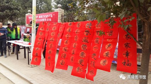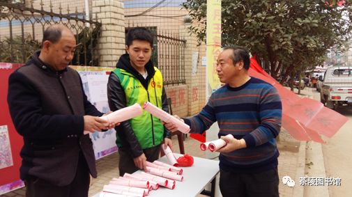 2月11日上午,严塘镇分馆(农家乐书屋)旁,整齐的展出了2018年“同祝中国梦 共度书香年”的年俗文化展,赶集的老百姓不时走过来,细细端详,感受浓浓的年味…… 文化志愿者向来来往往采购年货的老百姓介绍着本次活动内容,老百姓听到可以免费领取春联、福字、还可以看展览,不断发出感叹:共产党真好!然后,欢天喜地的挑起对联来。300余幅对联和200个福字不到半小时全部被百姓带回了家! 本次活动,受到严塘镇政府领导的高度认可和大力支持,文化站站长和农家乐书屋管理员也到现场和文化志愿者一起为百姓送春联、送福字来,并积极引导百姓走进书屋,了解书屋,进而充分发挥农家书屋的文化惠民作用,尽力满足农村群众春节期间的精神文化需求,让严塘百姓提前过一个书香年。 活 动 掠 影 春联来了 我领到了福字哦 农家乐书屋管理员为百姓挑选对联 回去让孙子帮我贴上 这是我选的春联 我不识字,小伙子帮我挑的 这春联,我喜欢