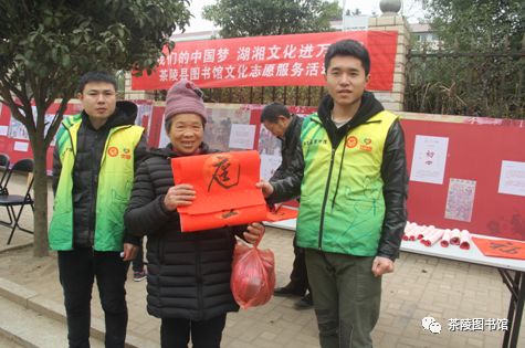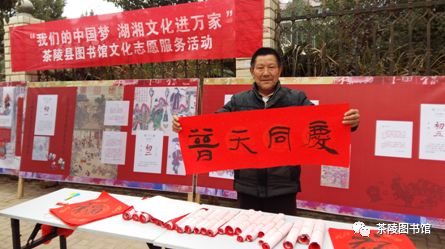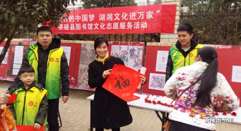 为深入贯彻落实党的十九大精神,结合省新闻出版广电局《关于春节期间充分发挥农家书屋作用 丰富农村群众精神文化生活的通知》要求,我馆积极引导文化志愿者和农家书屋管理员联合开展以“送春联、送福字、年俗文化展”为主要内容的“我们的中国梦 湖湘文化进万家”文化志愿服务系列活动。