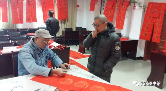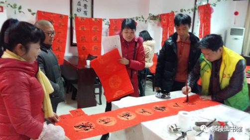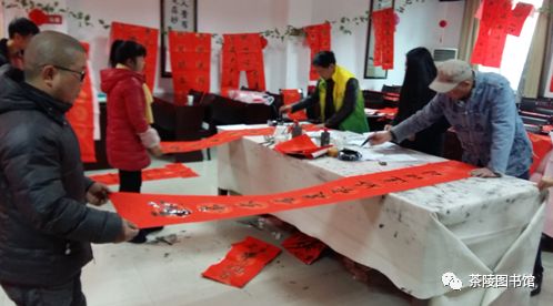 2月10日上午,茶陵县图书馆三楼多媒体室年味十足,红灯笼高高挂,春节对联写起来,福字捧起来,起鼓隆咚抢,起鼓隆咚抢…… 段老师的字太受欢迎了,排起了队。“我想要一幅十一言的,贴在我家老房子”,一位从新城区赶来的大姐对段老师说。 书法爱好者和书法老师热情交流,探讨起书法中“笔法”的运用,现场切磋起来…… 主题为“同祝中国梦 共度书香年”春节年俗文化展为百姓详细解说了中国春节期间的大小习俗,如果说春节是一台戏的话,那么腊月初八就是年节的开场锣,在吃了美味的腊八粥后,人们就开始为大年作准备…… 本次活动,共为读者送出春联近200余幅,福字150余对,提前为百姓送上年味“大礼包”,茶图所有工作人员提前祝您及家人:春节大吉,阖家欢乐。